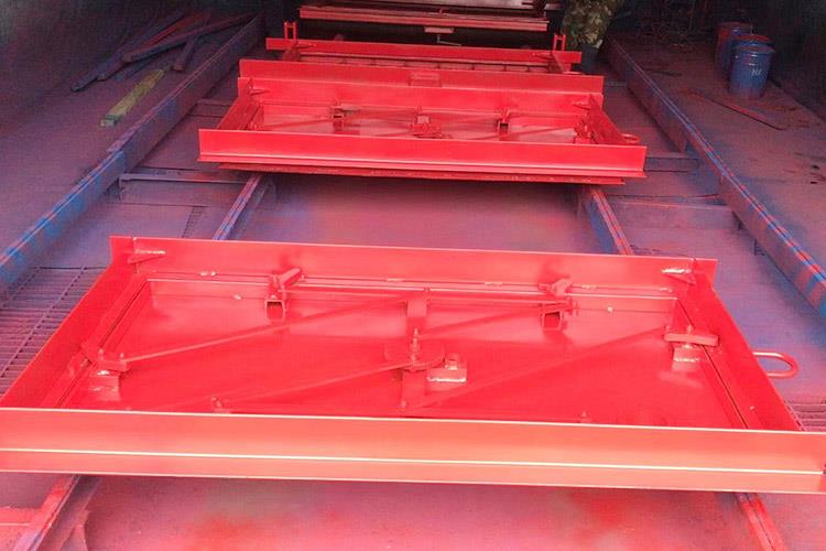 避難硐室密閉門使用對稱的方式進(jìn)行安裝,它的每一個安裝件都是使用鋼材料來焊接成的。避難硐室密閉門的門扇是由井字結(jié)構(gòu)來進(jìn)行焊接的,反風(fēng)的主要裝置是采用鋼管來插拴的,安裝的時候在合頁處涂上潤滑油,保證使用的靈活性。斜風(fēng)井防爆門關(guān)門時,各部件反向擺動,到關(guān)閉狀態(tài)時成矩形狀態(tài)。